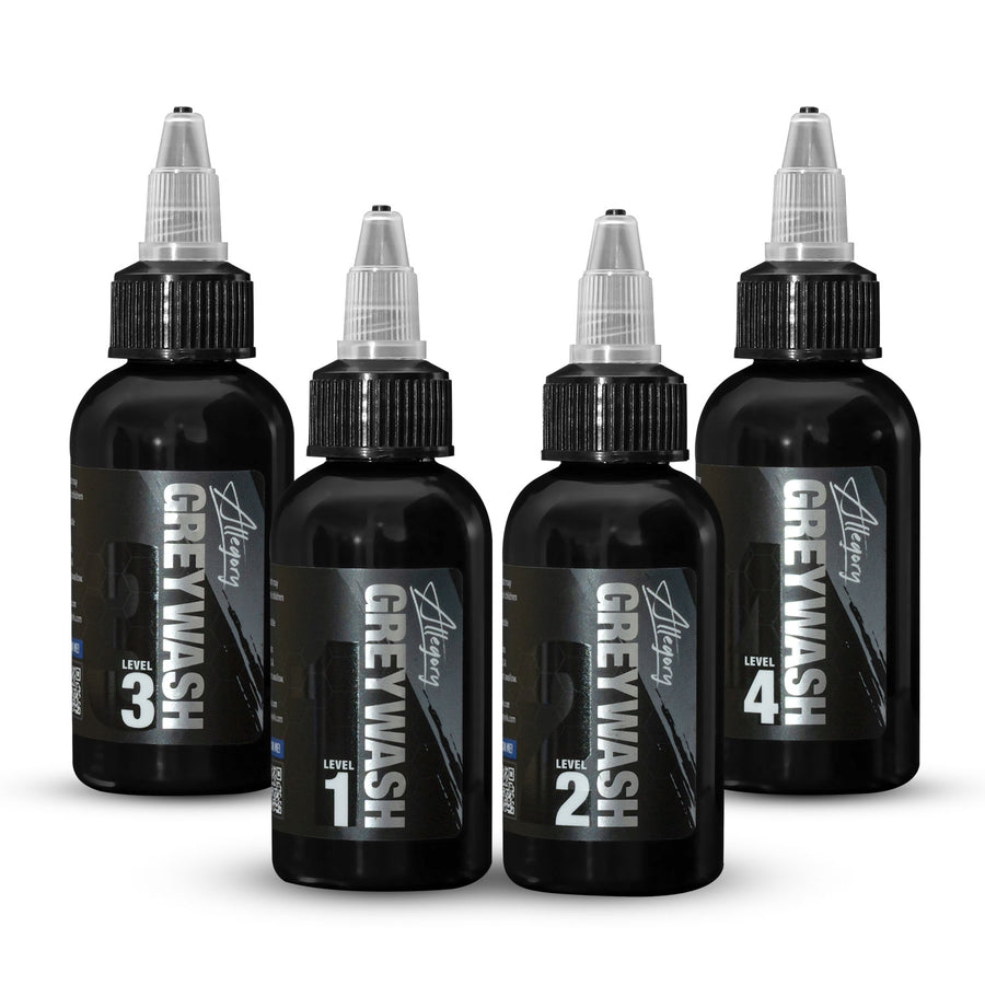 Elevate your tattoo work with the complete Allegory Greywash Set, featuring all four expertly crafted grey tones from Level 1 (Ultra-Light) to Level 4 (Dark). Designed to flow effortlessly and blend smoothly, this set allows full creative control across a wide tonal range. From delicate gradients to striking contrasts, each bottle is built for consistency, hygiene, and professional performance.