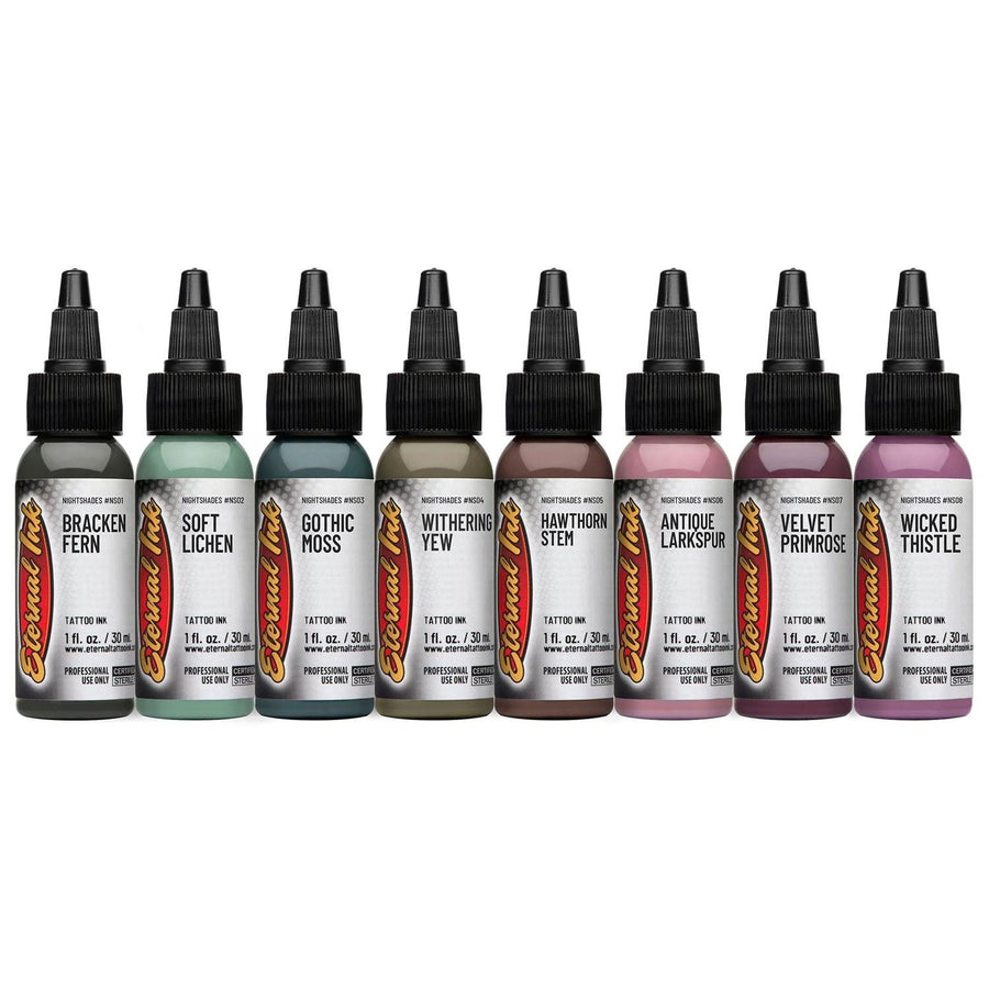 The Nightshades palette by Gia Rose is a collection of eight 1 ounce bottles of rich, muted tones inspired by Gia's Neo Romantic tattoo style. Working with Eternal Ink, Gia mixed a palette of color with impact and depth. These eight pigments include a range of mauves, dusty greens, and earthy brown hues. Paired with black of jewel tones, the Nightshades are an ideal expansion to enrich your tattoo color palette and add notes of dramatic color to your art.